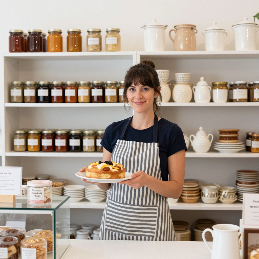 Smiling woman in a striped apron stands behind a counter at Rosemarie Deli and Cake Shop in South Yarra, holding a plate with a freshly baked treat, surrounded by shelves stocked with jars, bottles, and ceramic goods.
