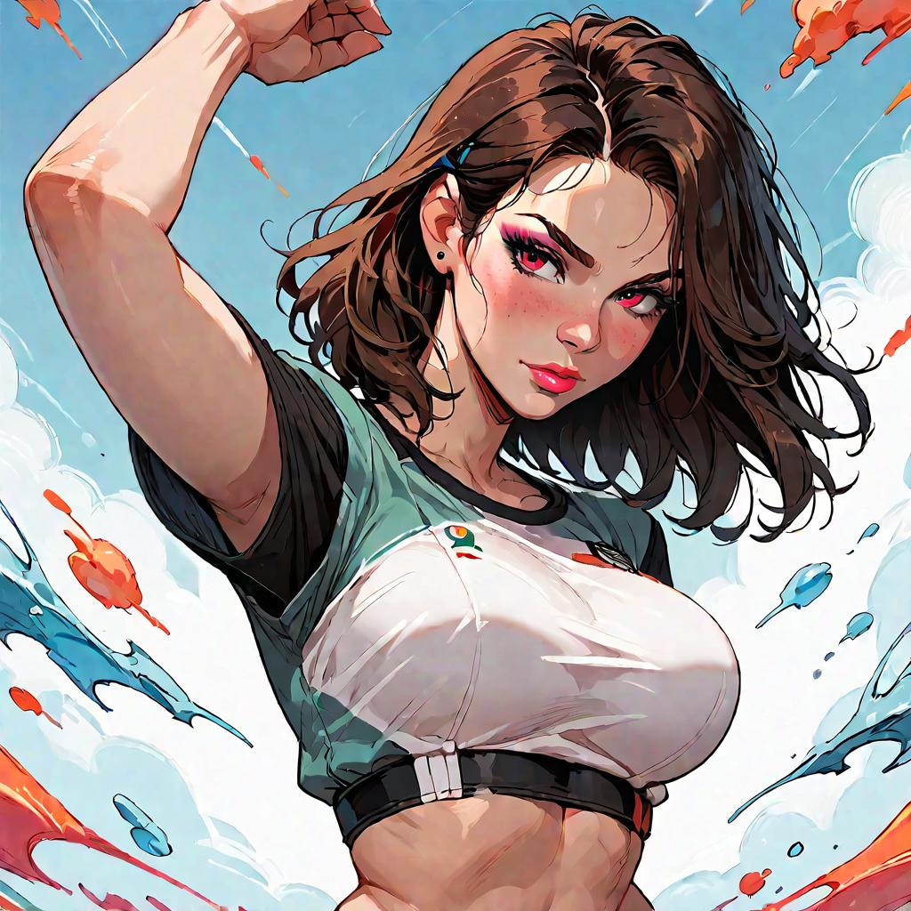 Digital anime-style illustration of a confident young woman with medium, messy brown hair and large breasts wearing a cropped top. She is in a fighting pose with her arm raised, looking directly at the viewer against a dynamic background with vibrant splashes of orange and blue.