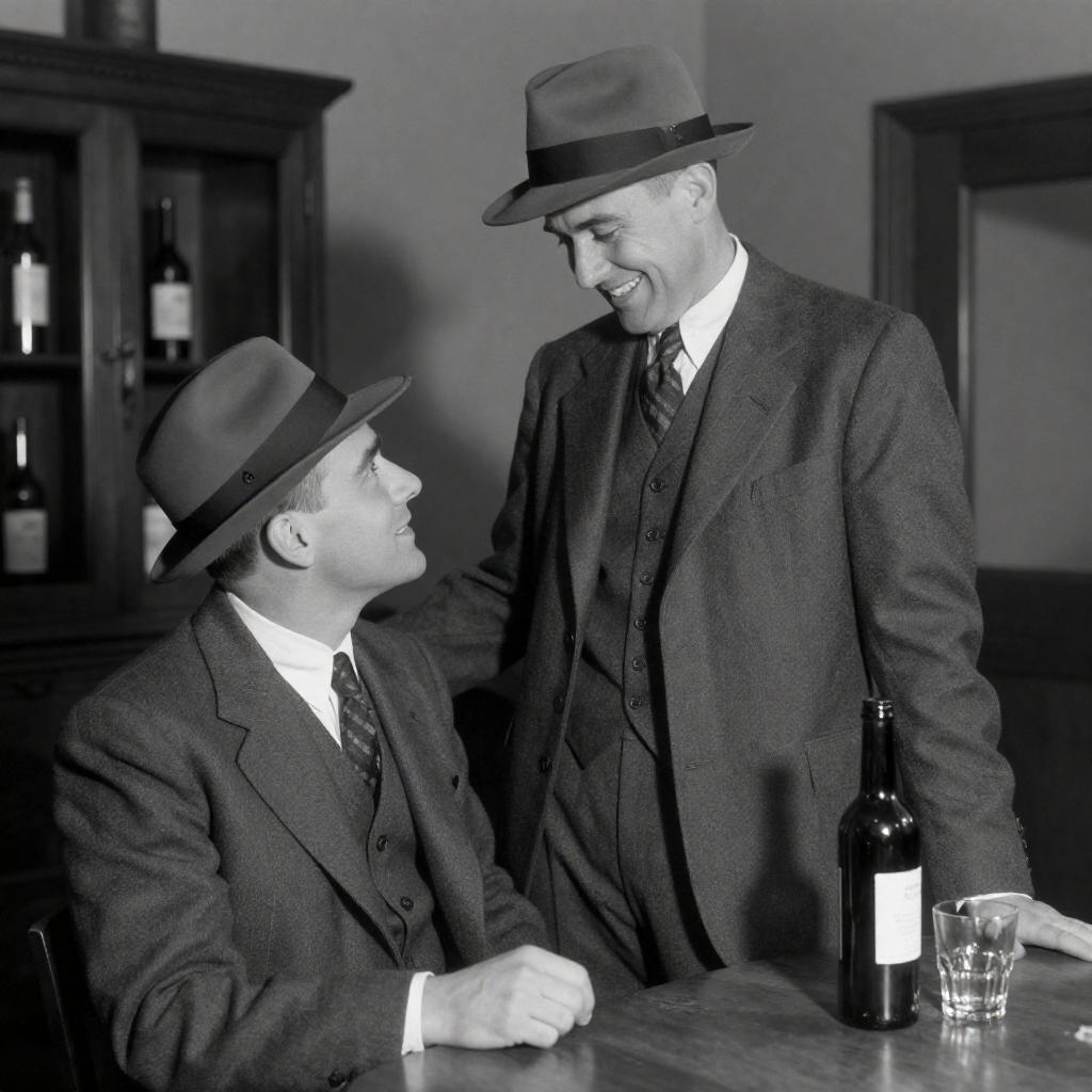 Black-and-white photograph of two men in a 1940s-style office. The younger man, with a light-colored fedora and patterned tie, hands a white object to the older man, who wears a pinstripe suit and white pocket square. Blinds and office furniture in the background. The older man looks at the object with interest.