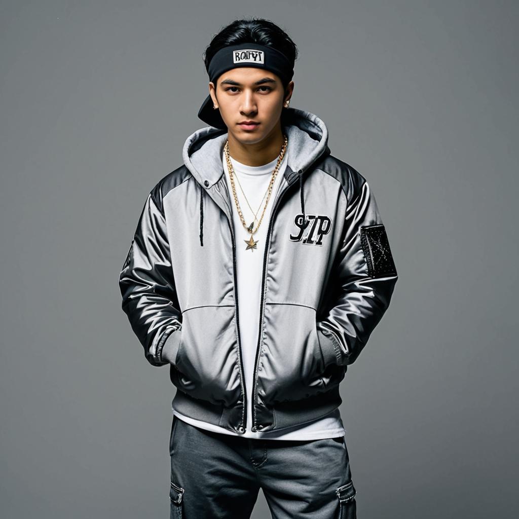 Portrait of a young man with black hair wearing a grey hooded jacket, white shirt, grey pants, and a black headband. He has gold chains with pendants around his neck and small earrings. The man is standing against a plain grey background, looking directly at the camera with hands in jacket pockets, embodying a modern hip hop fashion style.