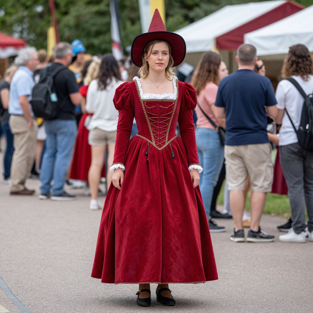Photograph of a young woman in a red velvet Renaissance dress and hat, standing in a crowded outdoor event with white and red tents in the background.