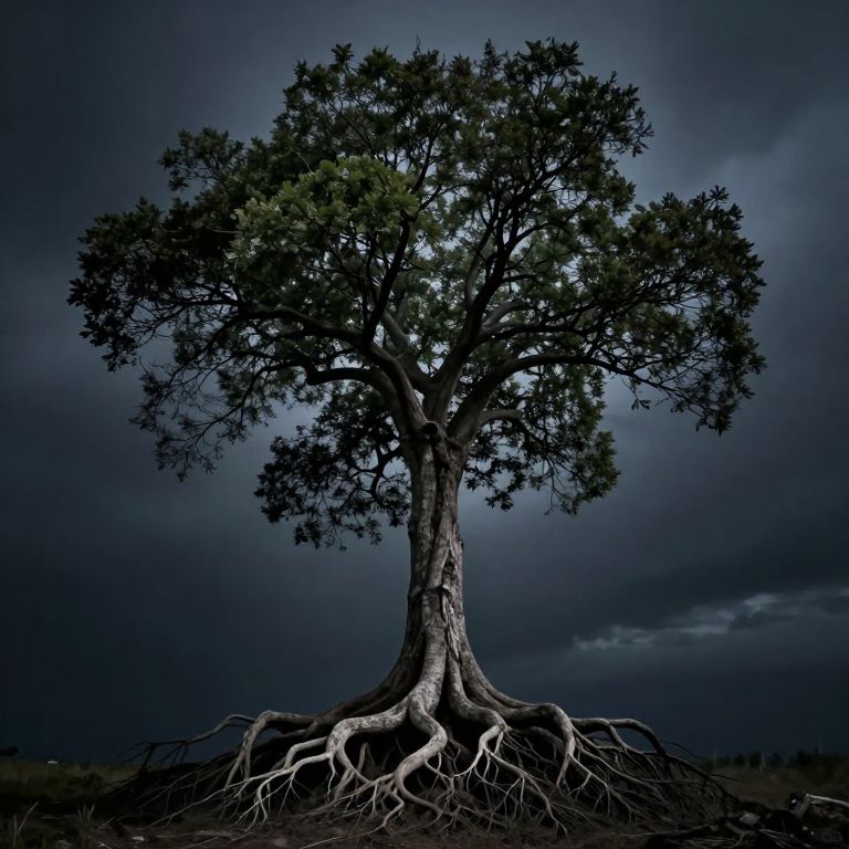 Roots reaching toward the cosmos, branches yearning for the heavens, and a trunk dissolving into the abyss—a solitary tree embodies the eternal struggle between grounding and transcendence, evoking a profound sense of existential longing and cosmic solitude.
