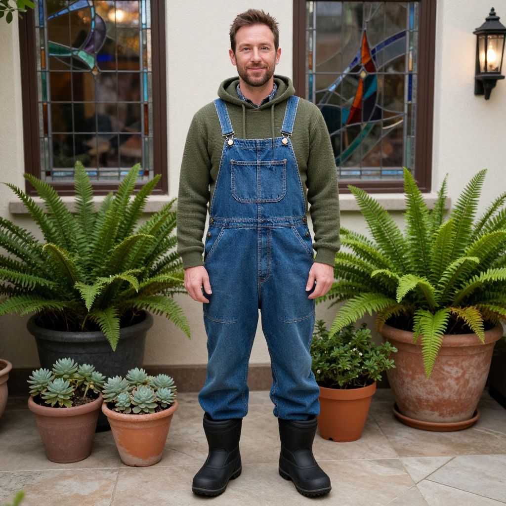 Photograph of a bearded white man with short brown hair, standing outdoors. He wears dark green hoodie, blue denim overalls with metal snaps, and black rubber boots. He has a friendly expression, arms relaxed by his sides. Behind him are two large potted ferns and smaller succulents on a tiled patio. The background features a window with stained glass and a black lantern. The setting appears to be a garden or courtyard. The man's attire and the greenery suggest a casual, rustic style. The lighting is natural, highlighting the textures of the overalls and plants.