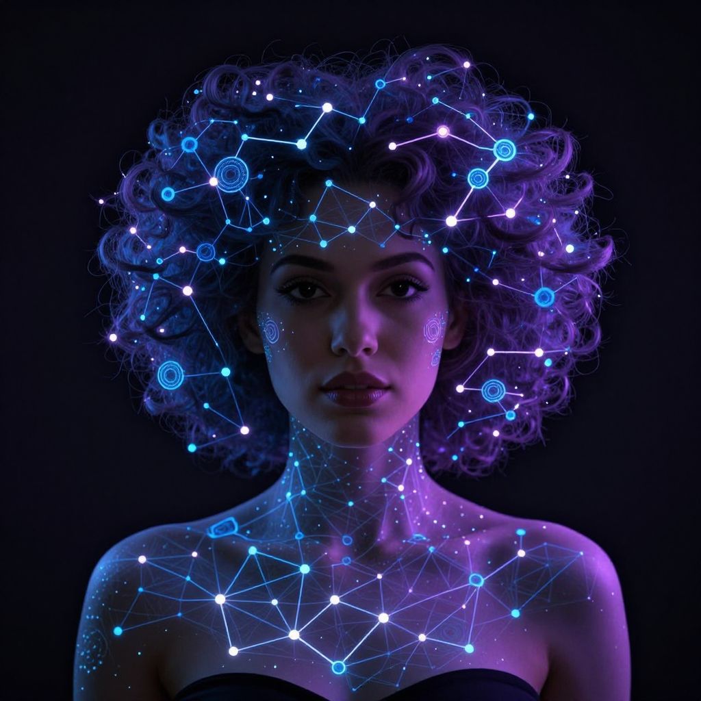 The image features a striking portrayal of a woman with a holographic constellation design. Her hair is styled in voluminous, curly puffs adorned with intricate, geometric patterns that emit a soft, luminescent glow. The patterns are composed of interlocking shapes, predominantly in shades of blue and purple, creating a mesmerizing effect. The woman's shoulders and upper chest are also embellished with similar geometric designs, which seamlessly blend with the patterns in her hair, creating a harmonious and cohesive look. The overall composition is balanced, with the patterns and colors creating a sense of depth and dimensionality. The background is a deep, dark hue, which contrasts sharply with the vibrant colors of the holographic designs, making them stand out even more. The interplay of light and shadow enhances the three-dimensional quality of the image, giving it a dynamic and visually captivating appearance.