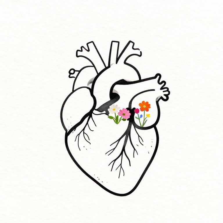 Simple anatomical heart with flowers sprouting from its chambers, clean minimal style, monochrome line drawing with splashes of colorful blossoms, modern botanical illustration, fresh and organic vibe, textured paper background for artistic effect.