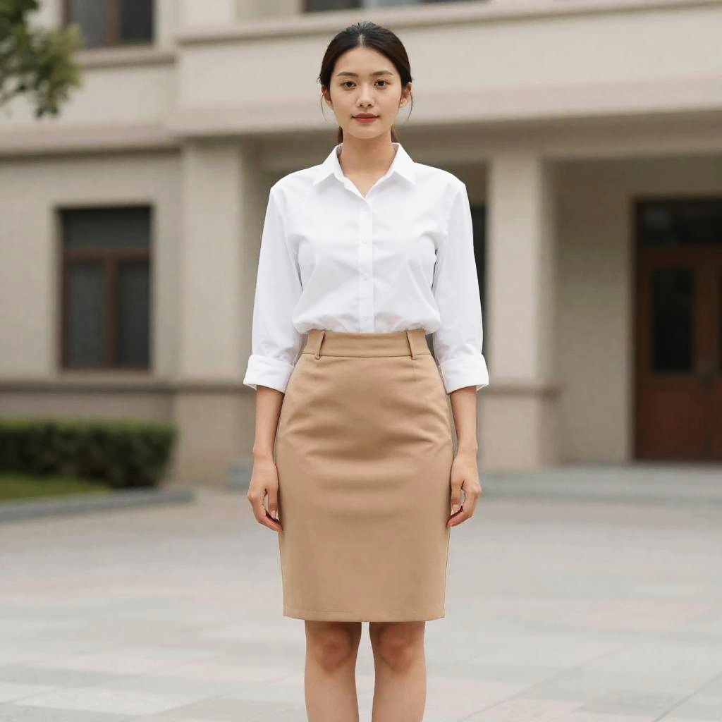 Piece Outfit, woman in a white shirt and black skirt standing in a courtyard