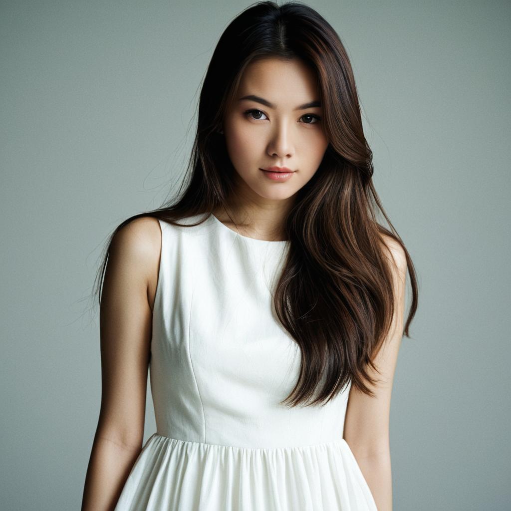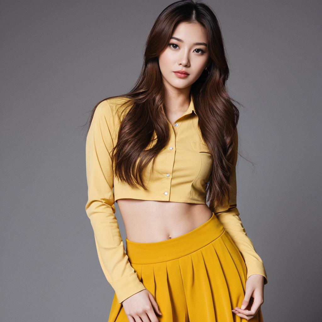 Photorealistic image of an East Asian woman with long brown hair and brown eyes, wearing a yellow long-sleeve crop shirt and matching yellow pleated palazzo pants. She is posing against a plain gray background, looking directly at the camera. The outfit highlights her midriff and navel, with a stylish and modern aesthetic influenced by K-pop fashion.