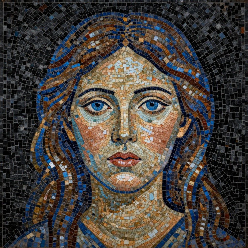 The image depicts a female figure rendered in a mosaic style, with intricate details composed of small, square tiles of various colors. The tiles are arranged to form a realistic representation of the woman's face and shoulders, creating a striking contrast against the dark background. The woman's hair, flowing and voluminous, is depicted with a mix of blues and browns, adding depth and texture to the overall composition. The tiles are meticulously placed to capture the subtle nuances of her skin tone, with shades of beige and brown blending seamlessly. The eyes, large and expressive, are the focal point, drawing the viewer's attention with their striking blue color. The overall arrangement of the tiles is balanced, with the woman's face centrally positioned, and the tiles gradually fading into the background, creating a sense of depth and dimension. The mosaic style gives the image a unique, artistic quality, blending traditional art techniques with modern digital rendering.