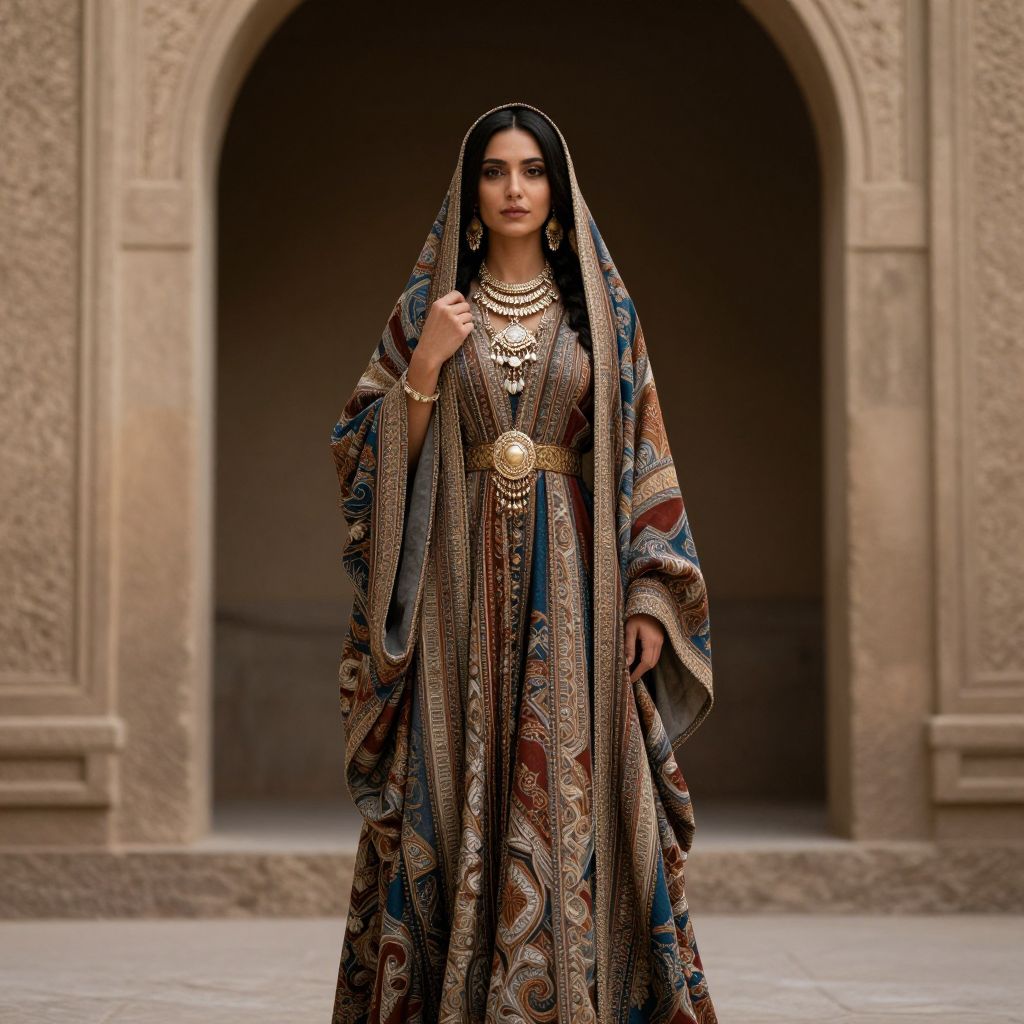 Woman draped in ornate robes stands gracefully against ancient stone arches, embodying timeless elegance with intricate jewelry and flowing garments that reflect cultural heritage.