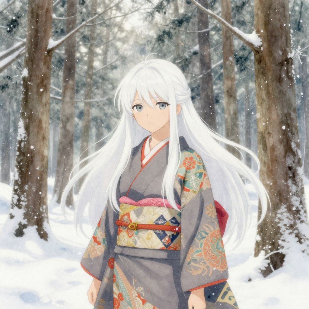Anime-style digital art of a white-haired girl in a detailed gray kimono, standing in a snowy forest, with tall trees in the background.