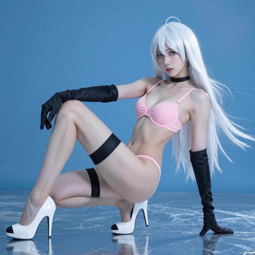Photograph of a dark-skinned woman with long, straight, white hair that reaches her thighs, wearing a white bikini. Her hair is adorned with a white flower on the left side. She has a toned, muscular physique with visible abdominal muscles and strong legs. Her expression is neutral, with dark eyes looking forward. The background is a solid, dark gray, and the lighting highlights her hair and bikini, creating a stark contrast with her skin. She stands barefoot, with her arms relaxed at her sides.