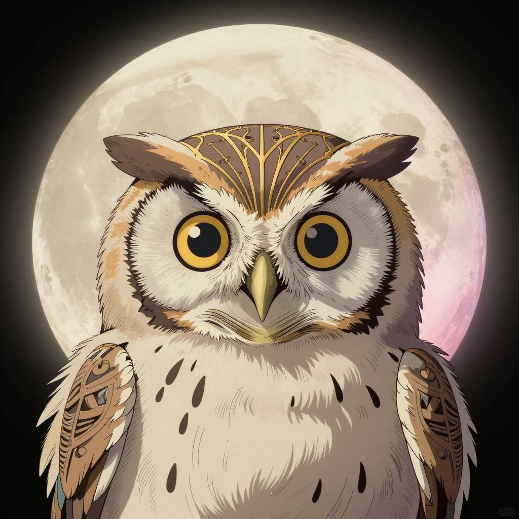 Extreme close-up macro shot of a fluffy owl chick in a Studio Ghibli meets art deco, rendered with soft ethereal moonlight, vector-sticker simplicity, pastel gradient backdrop, graffiti accents, golden-ratio composition, detailed comics inking, crisp line art, ultra-high-res 8K, intricate textures, black background, no watermark.
