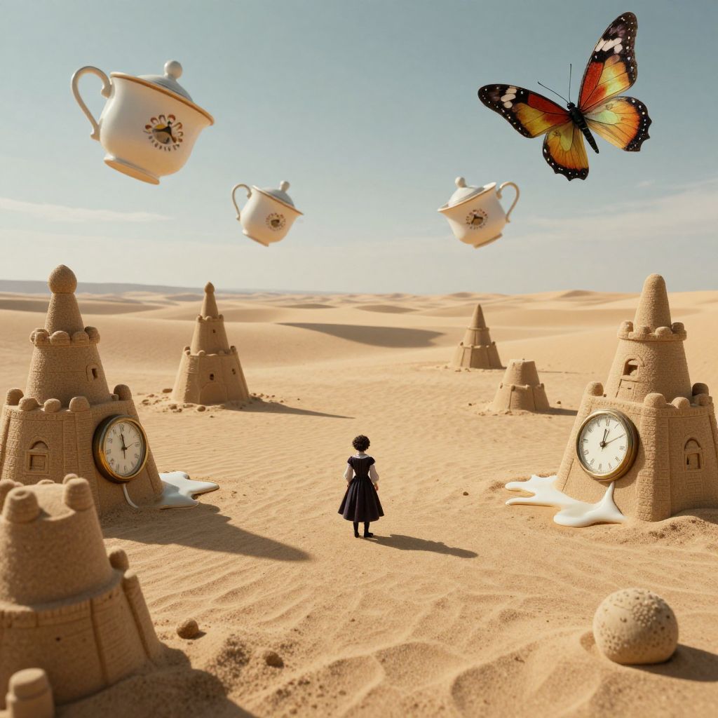A storm cloud hovers over a city square like a clockwork beast, raining instruments that harmonize with the ambient sounds of the town.