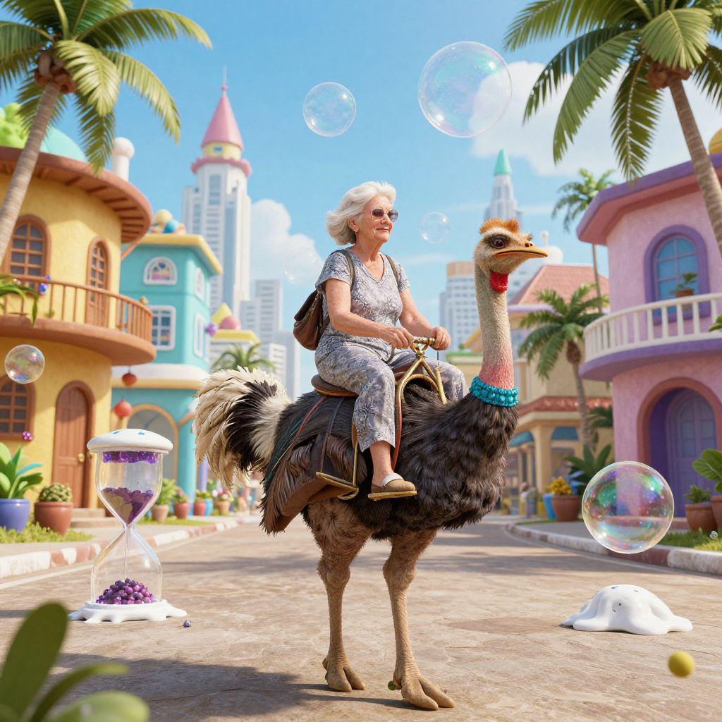 An elderly woman rides a clockwork ostrich with melting hourglass feathers through a tropical city where buildings are made of soap bubbles.