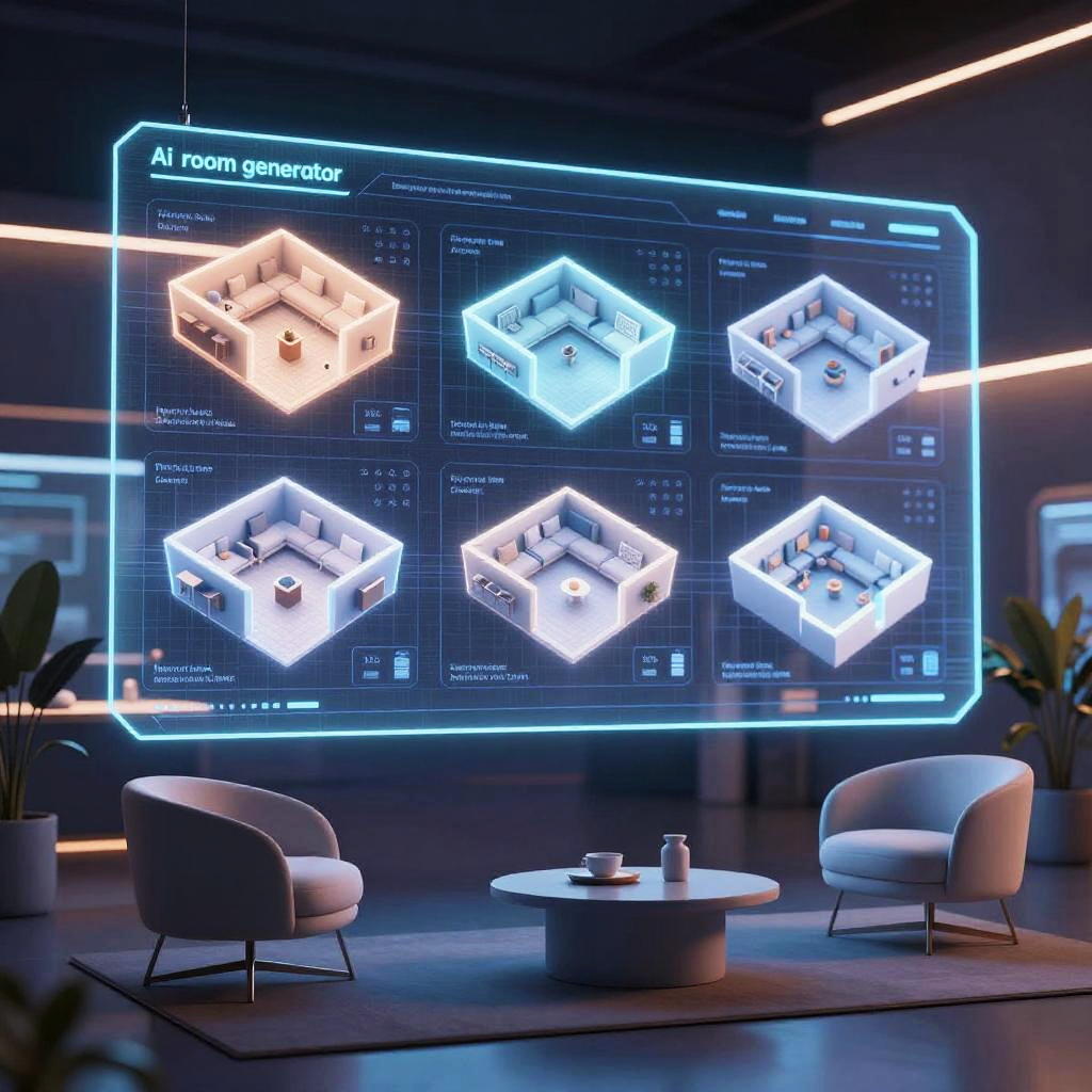 AI room generator free interface showing a futuristic digital design studio, glowing holographic screens with 3D room layouts, modern minimalistic furniture, ambient neon lighting, sleek user interface elements, high-tech and creative atmosphere