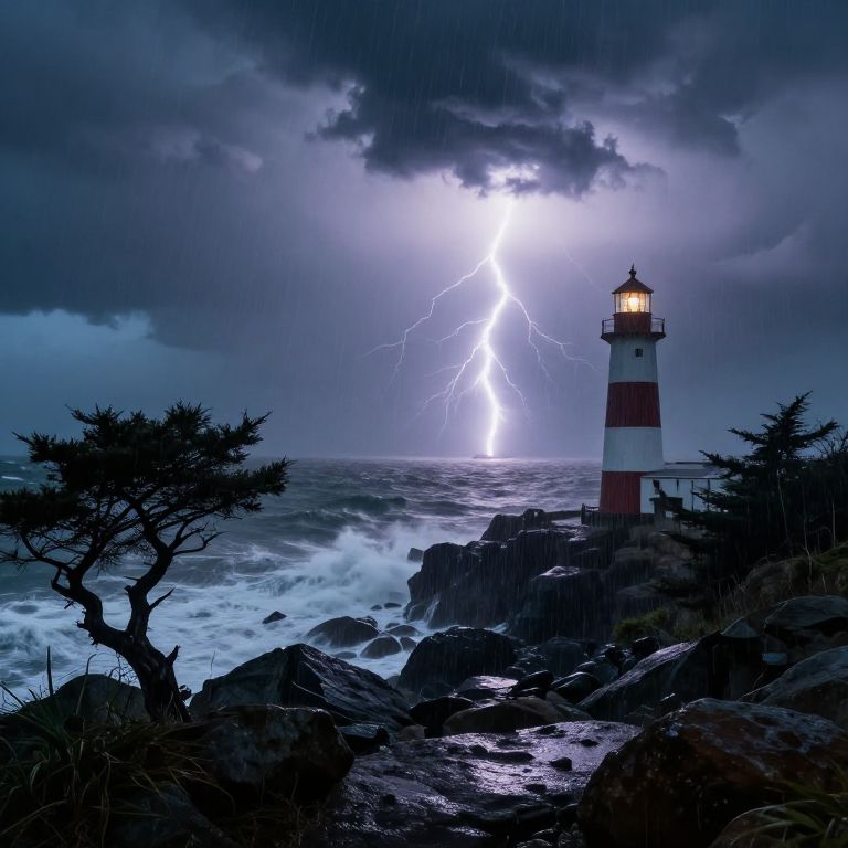 Lighthouses in stormy weather with dark clouds and heavy rain, lightning illuminating the turbulent sea, rugged terrain with twisted trees and wet stones, dramatic composition with dynamic lighting, intense and powerful maritime atmosphere, realistic style