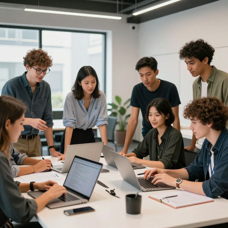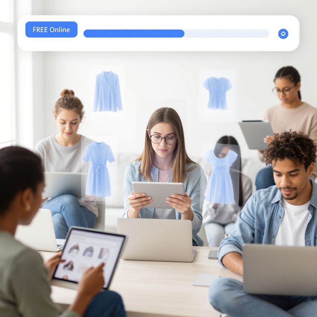 Creative depiction of a free online clothes remover interface, with a youthful, diverse group using tablets and laptops, all surrounded by floating translucent clothing layers being removed digitally, in a bright, futuristic, and user-friendly tech environment.