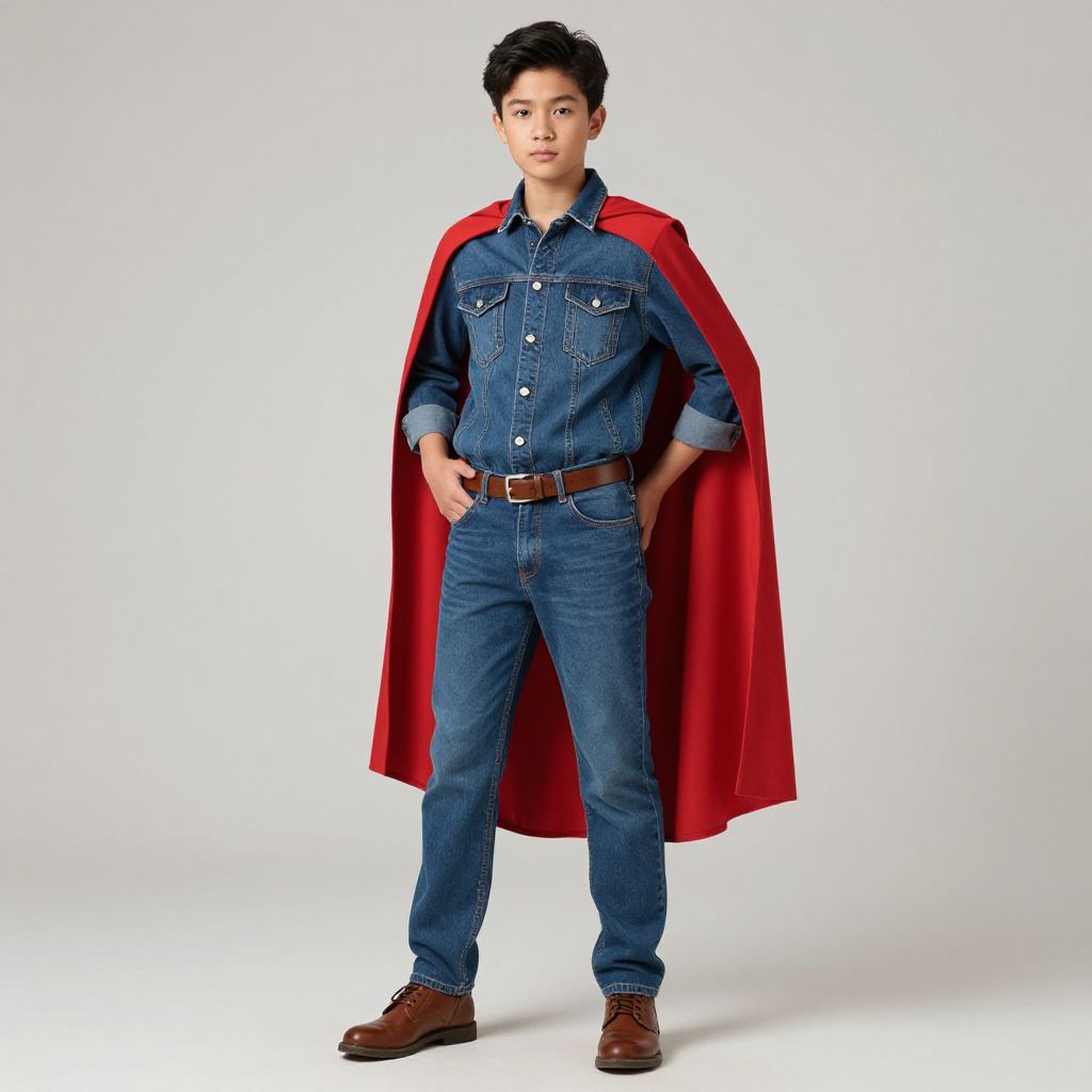 "superheroes simple costume, 1boy, male focus, solo, realistic, cape, sneakers, shoes, parody, raglan sleeves, pants, standing, full body, denim, asian Realistic photo of casual sexy person with pretty face"