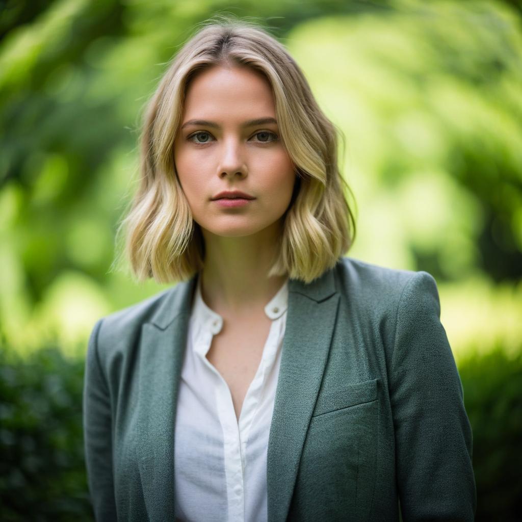 A moody portrait of a young woman with shoulder-length blonde hair wearing a classy gray blazer standing in front of a blurred green leafy background, soft natural lighting, shallow depth of field