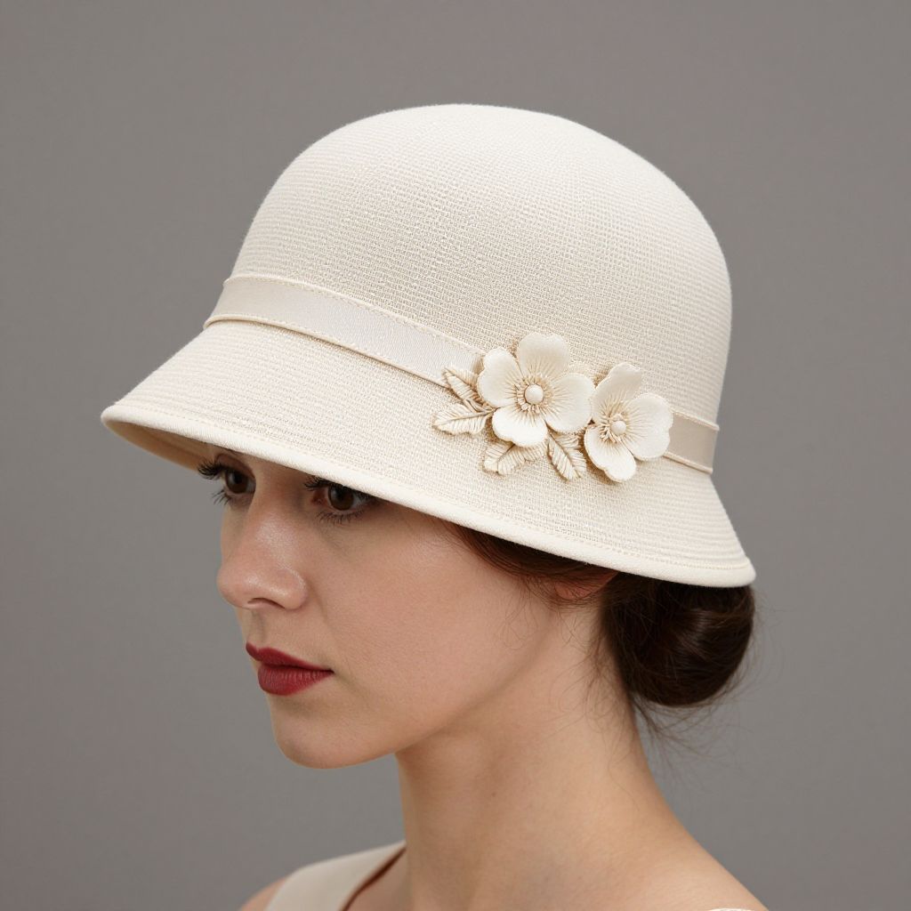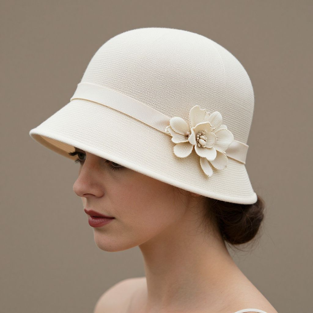 Woman wearing a vintage-style 1920s cloche hat crafted in ivory, featuring a delicate floral embellishment and a subtle ribbon accent, showcasing timeless elegance against a neutral backdrop.