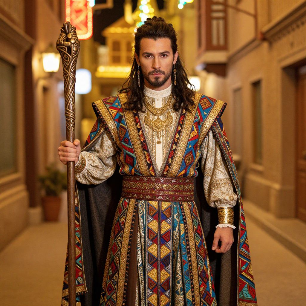 The image features a man dressed in an elaborate, colorful costume reminiscent of a mystical character, complete with intricate patterns and a majestic cape. He holds a staff, adding to the enchanting atmosphere of the scene, which is set in a vibrant alleyway illuminated by warm lights. This striking portrayal evokes a sense of fantasy and adventure, perfect for storytelling or creative projects.