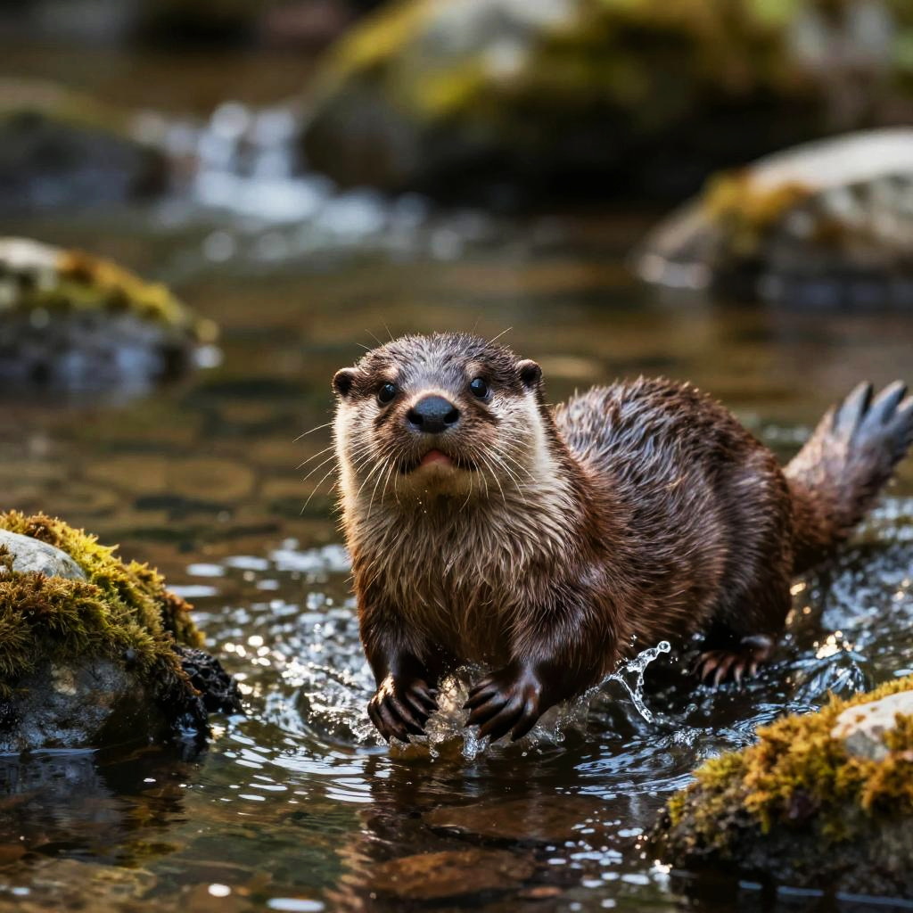 Curious river otter splashing playfully on clear freshwater stream surrounded by mossy rocks, in vivid and sharp nature close-up; heroic stance, warm rim light, detailed textures and fine fur/skin, expressive eyes, atmospheric perspective, low-angle dramatic view, leading lines, balanced rule-of-thirds composition, soft background separation, high dynamic range feel, ultra sharp subject, natural color grade, subtle haze, microcontrast on edges, immersive realism, SDXL, 8k resolution