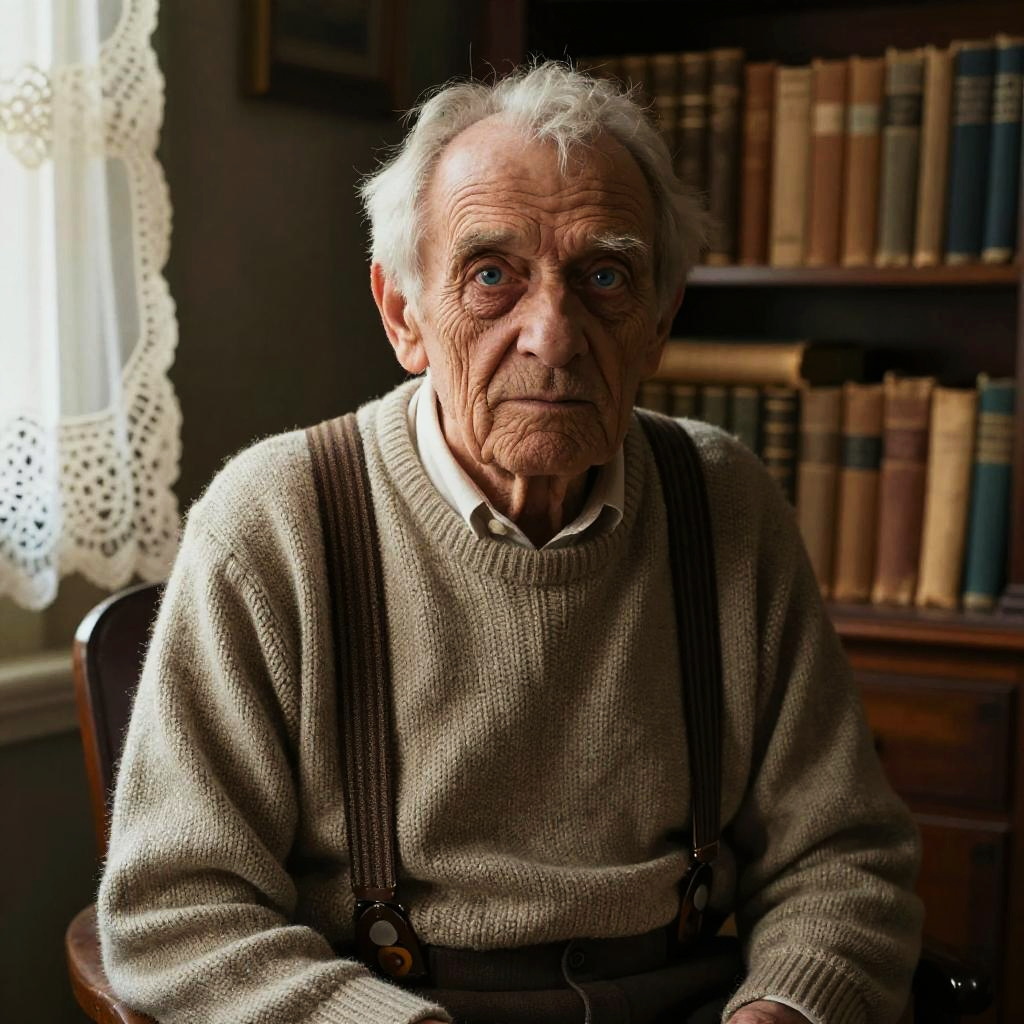 Portrait of a geezer with deep wrinkles and blue eyes, wearing a knitted sweater and suspenders, seated in a cozy rustic room filled with antique books and warm sunlight filtering through lace curtains, detailed textures and soft shadows.