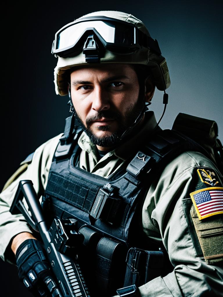 Man in Seal Team Six Raid interval costume, professional cosplay studio portrait, realistic detail