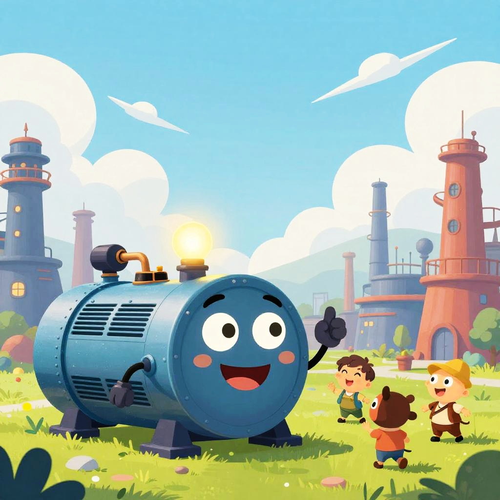 Generator cartoon of a large vintage electricity generator with anthropomorphic features, smiling face, glowing lights, set in a whimsical factory with bright colors, stylized clouds of steam, and friendly animated characters interacting.