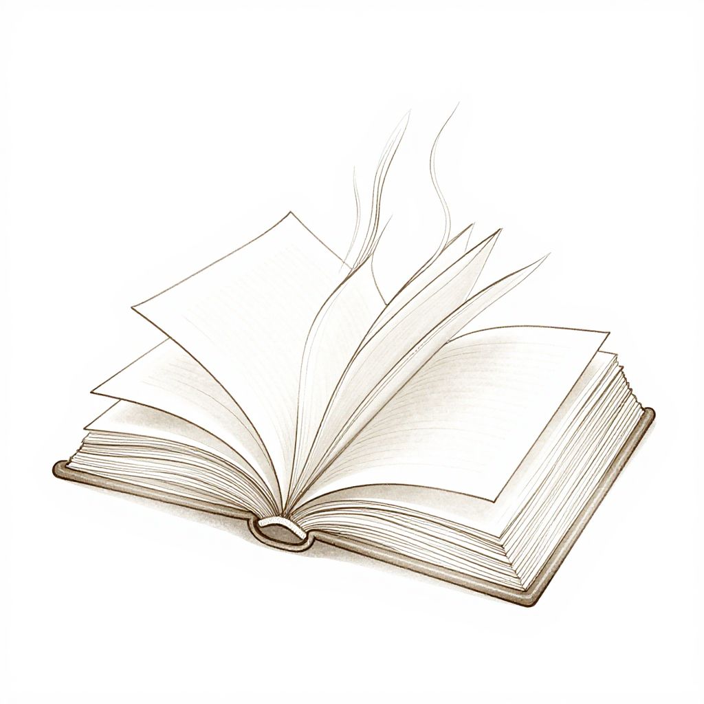 Illustration of an open book with pages blowing upward, detailed with black ink lines and a white background, showing motion and texture.