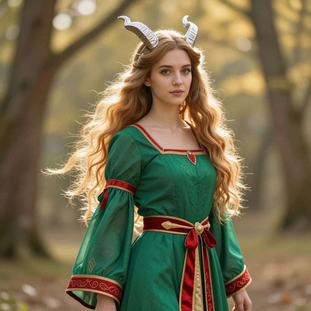 A beautiful young woman with long, flowing hair and delicate features, adorned with elegant silver horns on her head that shimmer subtly in the light. She wears a vibrant green dress with intricate red accents along the sleeves and hem, and a rich red and gold belt that ties securely at her waist, adding a touch of regal elegance. Her expression is calm and confident, standing in a sun-dappled forest clearing with soft golden light filtering through the trees, creating a mystical and enchanting atmosphere.