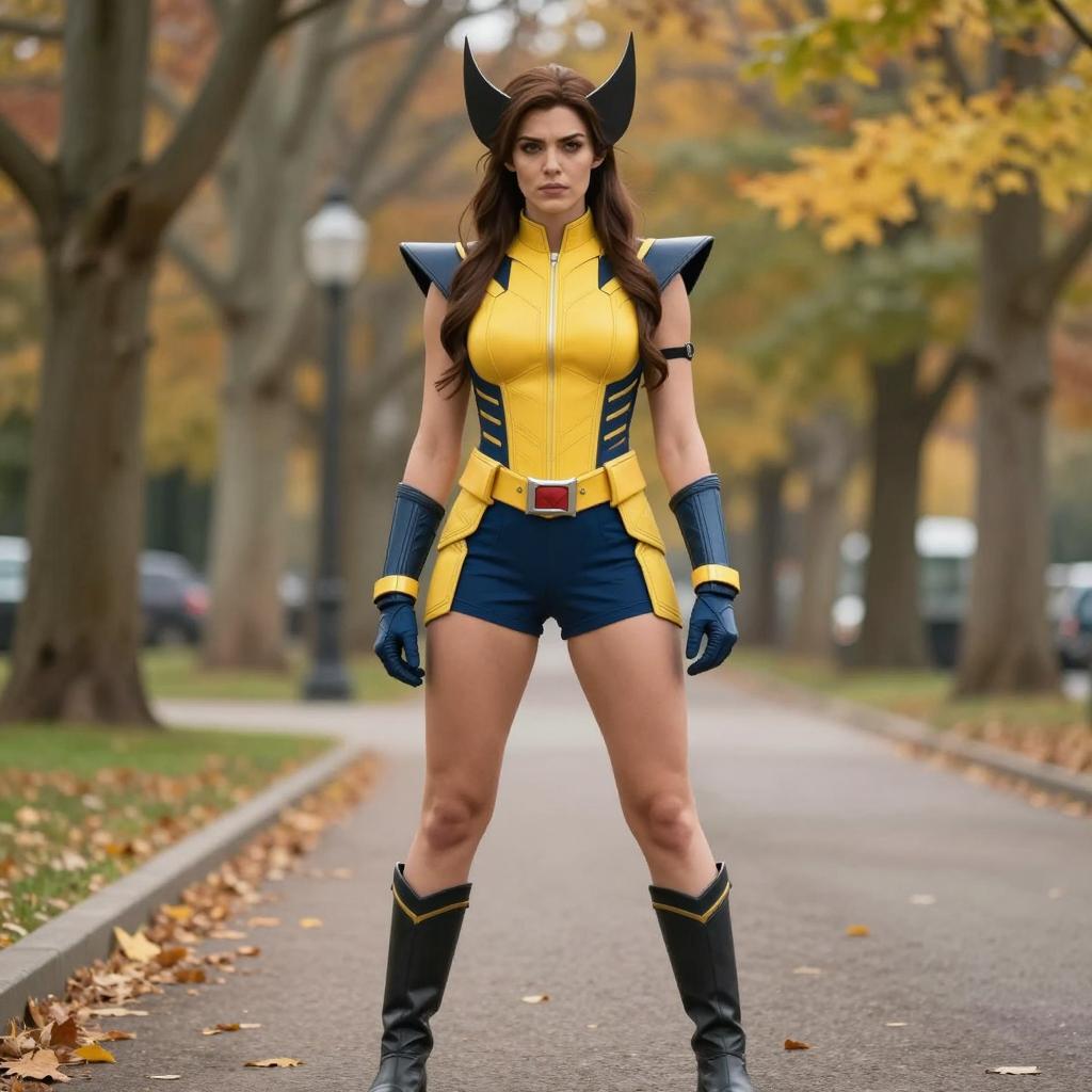 Portrait of a plus size adult woman dressed in a detailed black leather Black Widow cosplay from Marvel. She wears a form-fitting suit with a deep V-neck, a black helmet featuring horn-like structures, and a belt with a circular emblem. The woman has long wavy brown hair, green eyes, and dark lipstick makeup. The image is captured outdoors with natural lighting, showing a confident pose against a blurred background of greenery and a brown building.