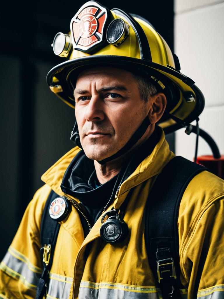 Man in Firefighter costume, photorealistic editorial portrait, sharp detail