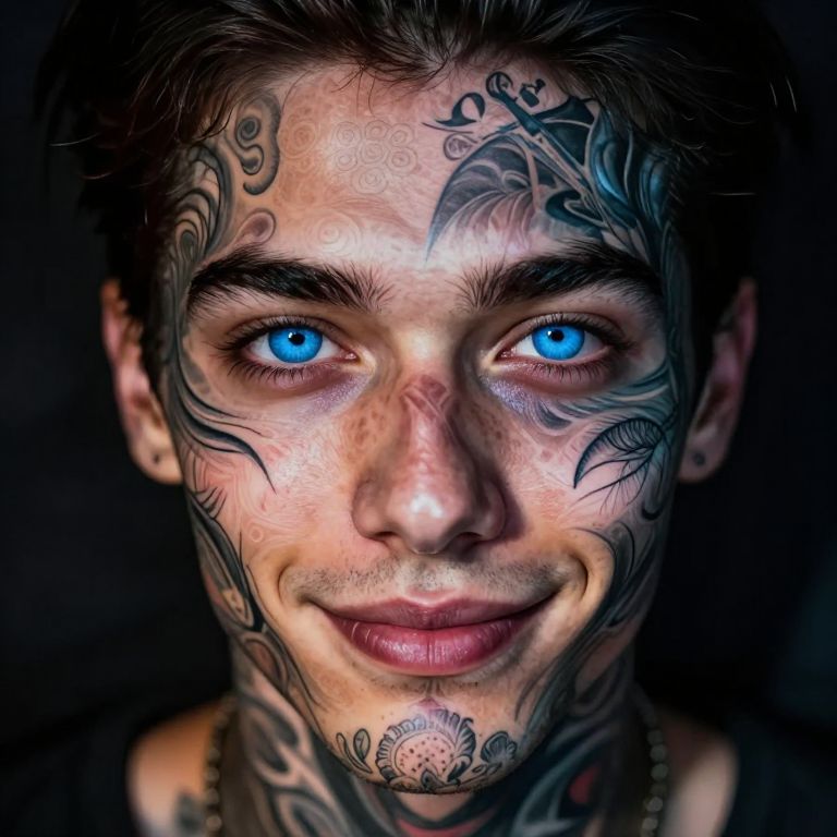 Craft a cutting-edge digital art portrait photo of a tattoo artist with kind blue eyes and an enigmatic smile. Capture their intricate facial patterns seamlessly merging into surrounding shadows from an aerial perspective. Vibrant high-contrast lighting should highlight the delicate tattoos while casting dramatic shadows on chiseled features, creating a mesmerizing gradient of emotions that invites viewers to explore the artist's soul.