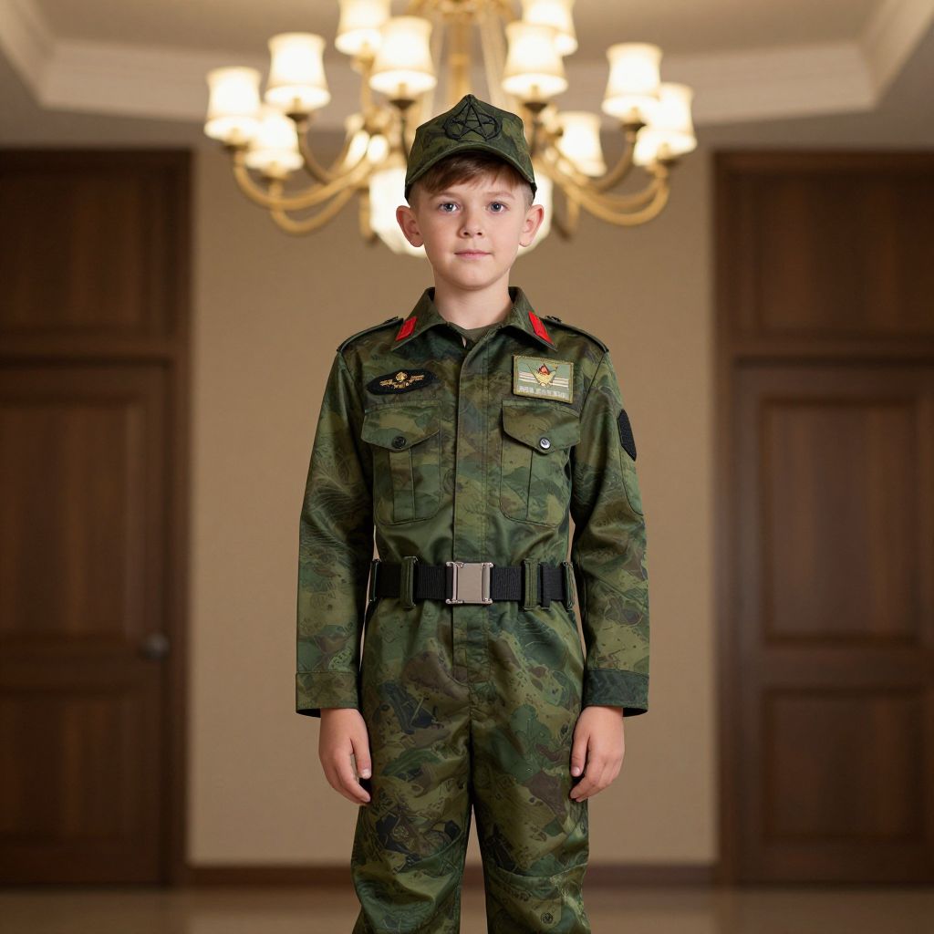 Photograph of a young boy in a military-style camouflage uniform with a black cap, standing in an elegant, chandelier-lit room.
