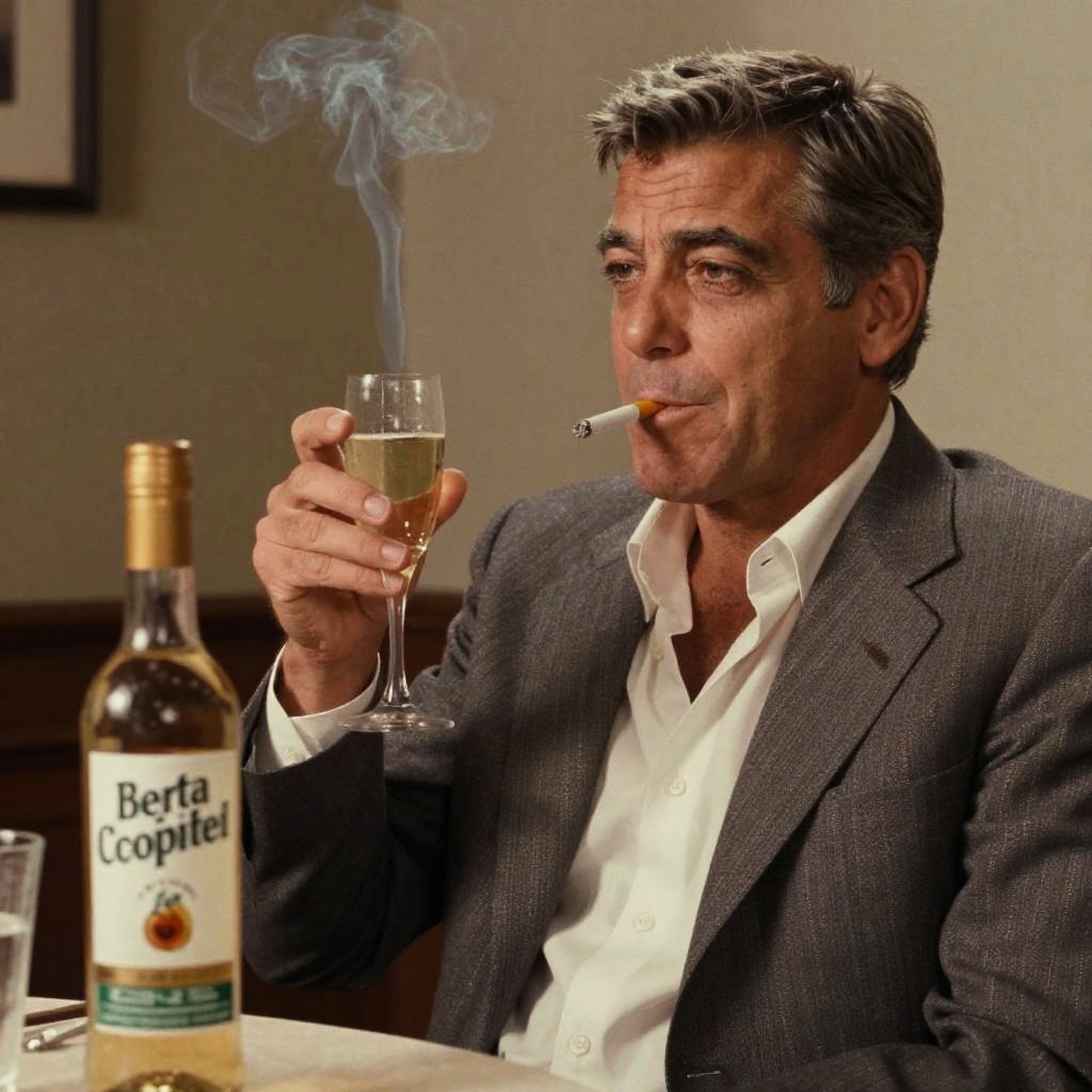 Realistic photo.George Clooney, elegant suit, toasting with champagne, faded vintage 1970s alcohol advertisement, smoking a cigarette, Bulb Mode 35mm film photograph, medium grain, 24mm zeiss lens, fuji film stock realistic photo