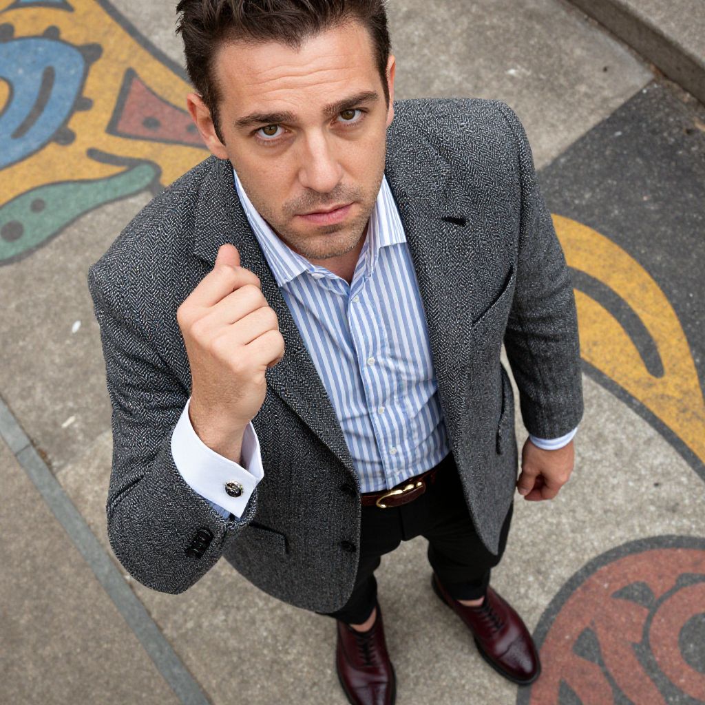 A man, classic striped dress shirt, grey herringbone blazer, black dress pants, gunmetal cufflinks, burgundy leather brogues, colorful murals, overhead shot, confident expression Man has masculine face and piercing eyes
