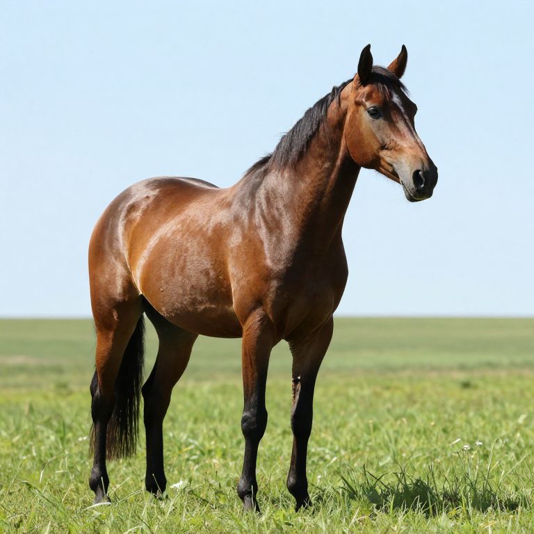 Photograph of a brown horse standing in a grassy field under a clear blue sky. The horse has a shiny, well-groomed coat with a black mane and tail. Its muscular build is evident, with a strong neck and legs. The horse's head is slightly turned to the right, showing a calm and alert expression. The grass is lush and green, stretching out to meet the horizon. The bright sunlight casts soft shadows on the horse's body, highlighting its smooth texture. The background is simple and unobstructed, emphasizing the horse as the focal point of the image.