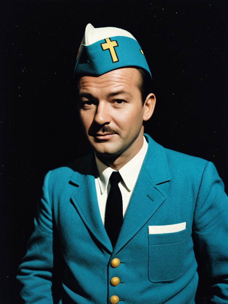 Man in Tintin Costume, waist-up editorial portrait, photorealistic tones