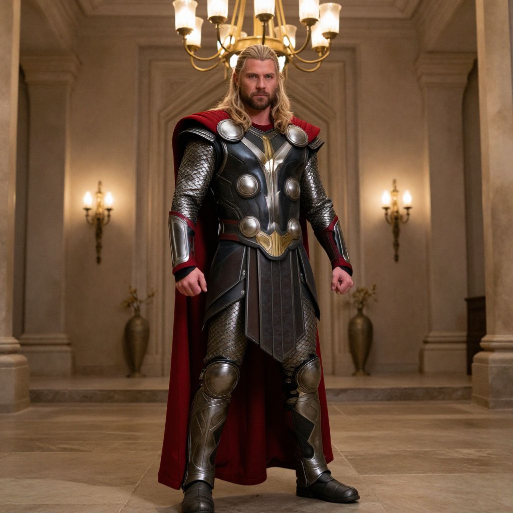 God War Ragnarok Thor Costume, man dressed in armor standing in a room with a chandelier
