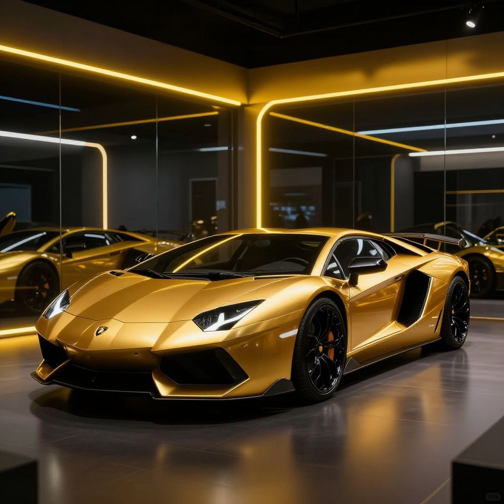 Gold neon Lamborghini speeding through a futuristic city at night, reflecting vibrant neon lights on its sleek metallic surface, surrounded by glowing skyscrapers and dynamic light trails, cyberpunk style with ultra-detailed reflections and sharp contrasts.