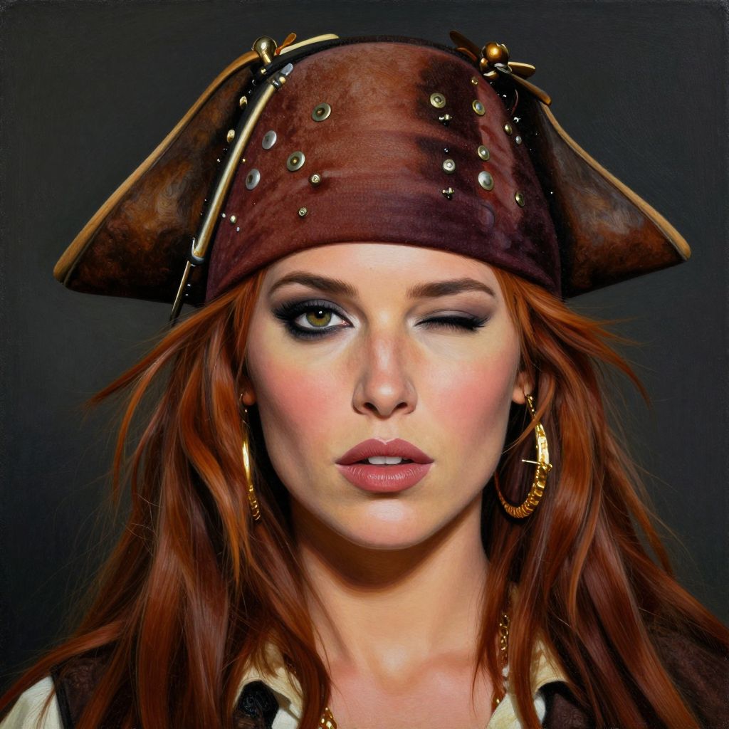 Photograph of a fair-skinned woman with red hair, wearing a brown pirate hat adorned with gold studs, winking, and sporting gold hoop earrings