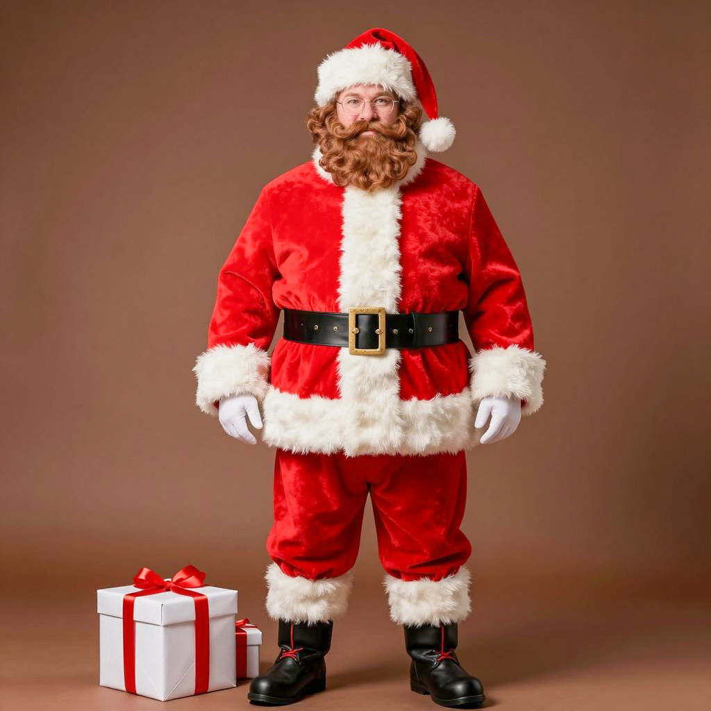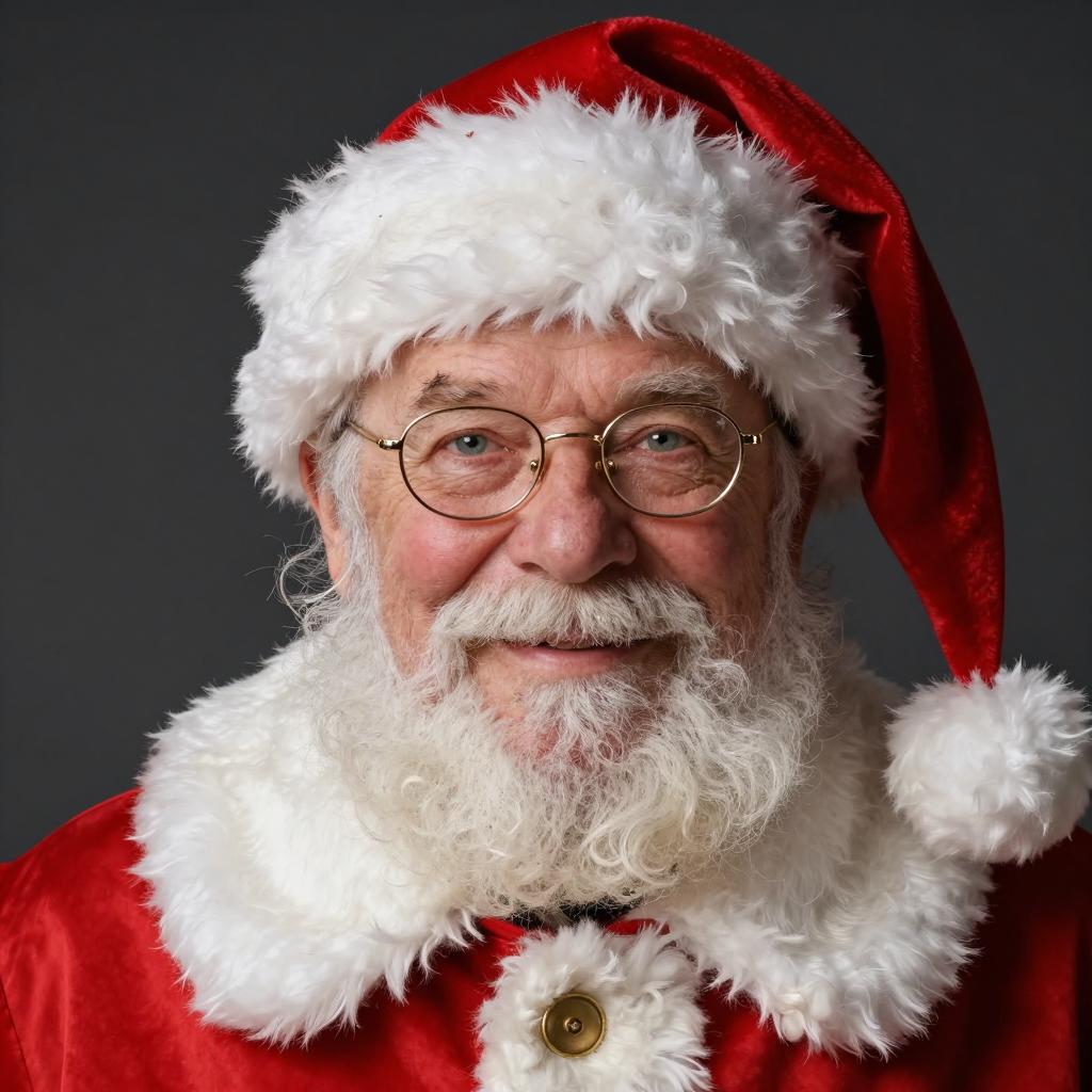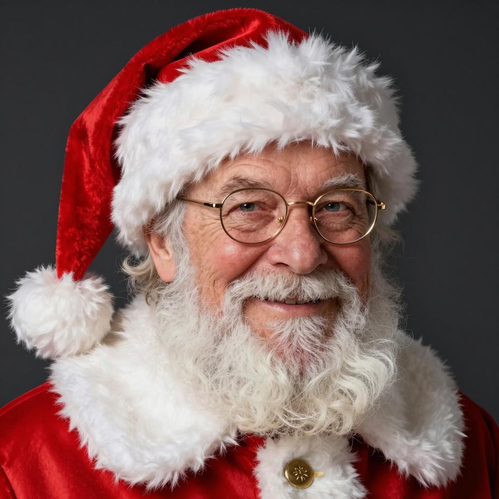 Photograph of an elderly Santa Claus with a white beard and mustache, wearing gold-rimmed glasses and a red Santa hat with white fur trim. He has a warm, smiling expression and is dressed in a red Santa suit with white fur. Dark background. Close-up portrait.