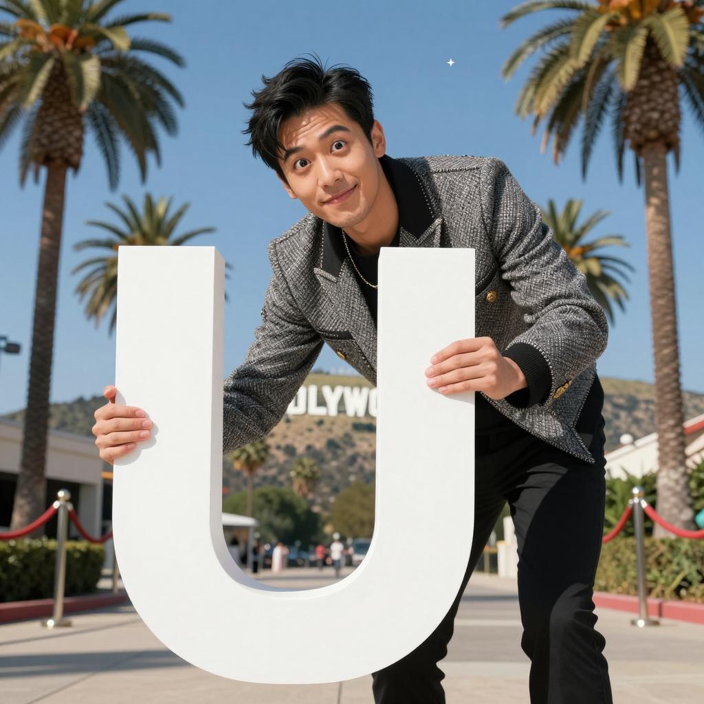 Man with short black hair in gray tweed jacket and black pants holds large white letter "U" with both hands. He leans forward, smiling, eyes wide. Background has blue sky with stars, palm trees, red rope barriers, and Hollywood sign. Digital illustration.