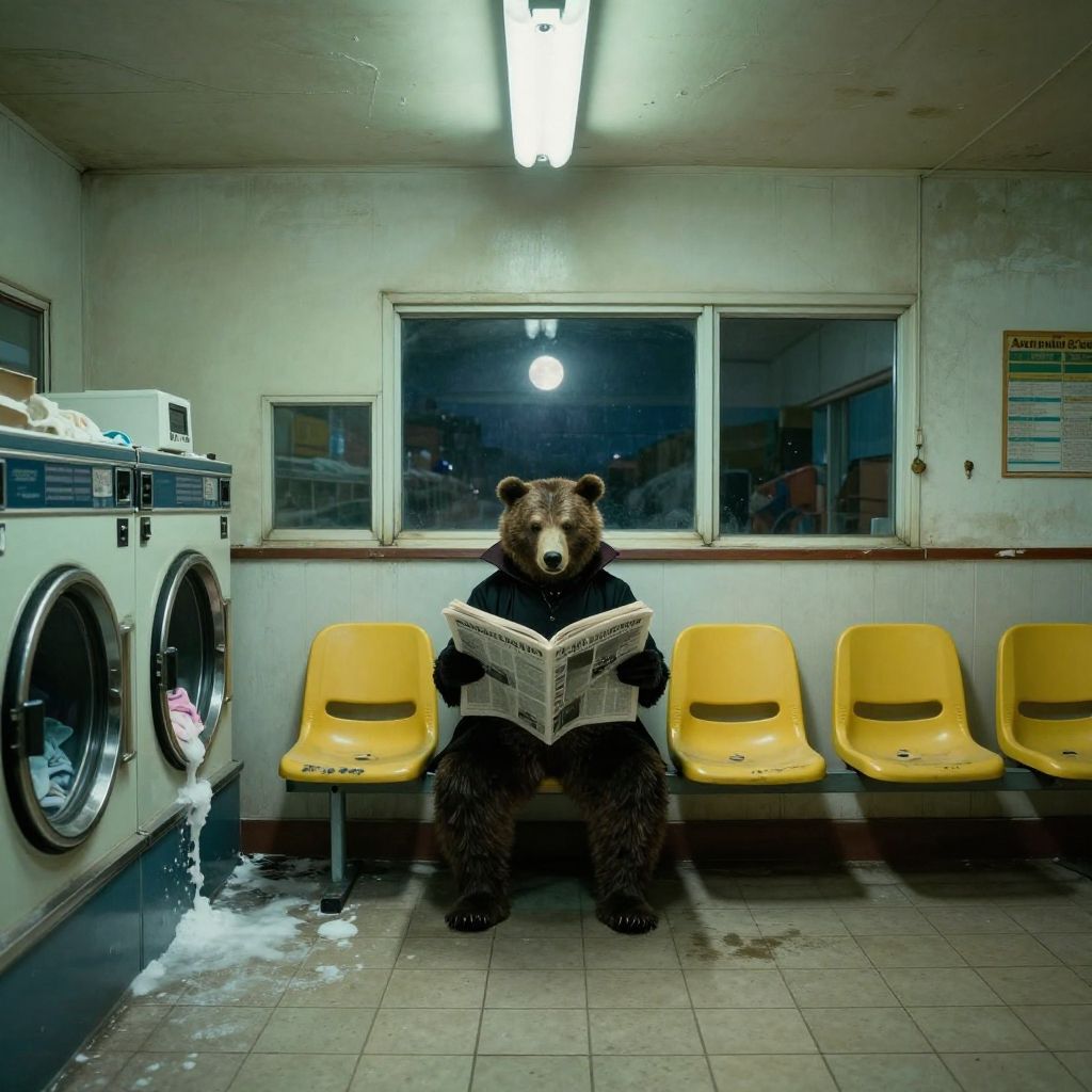 Photograph of a surreal scene in a dimly lit laundry room. At the center sits a bear wearing a black sweater, reading a newspaper. The bear's fur is dark brown, and it is seated on a yellow plastic chair among five others in a row. Behind the bear, there is a large window reflecting a dark, night-time exterior. To the left, there are two white front-loading washing machines with a small puddle of water on the floor in front. Above, a fluorescent light fixture illuminates the room. A laundry sign is visible on the right wall. The overall scene is eerie and whimsical.