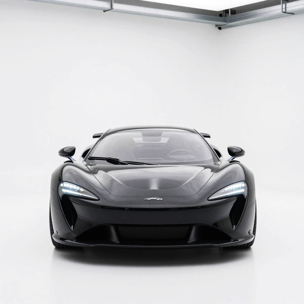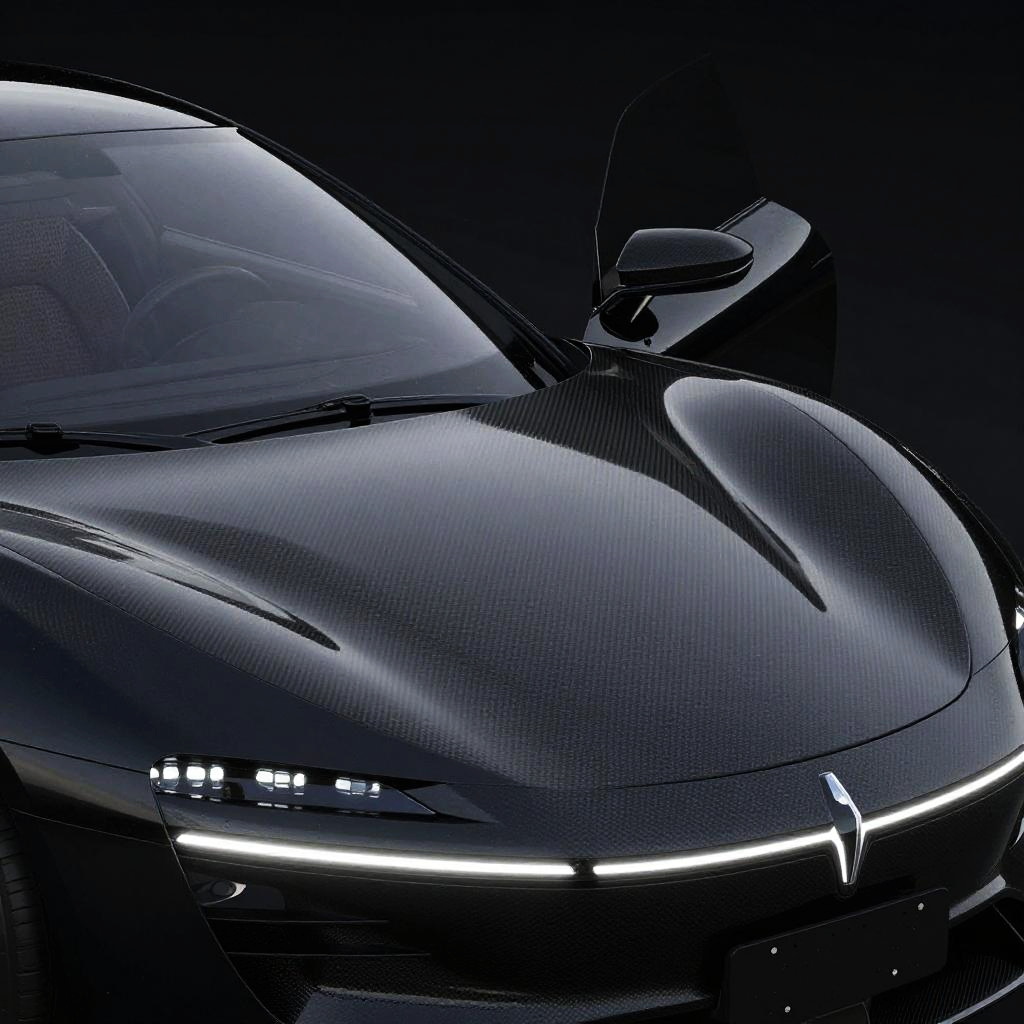 This is a digital rendering of a sleek, futuristic black and white hovercar with a streamlined design and two prominent vertical tail fins. The car has smooth curves and a glossy finish, with sharp headlights and a narrow windshield. The background is stark white, making the car's dark colors pop, and it's framed by gray borders on both sides.
