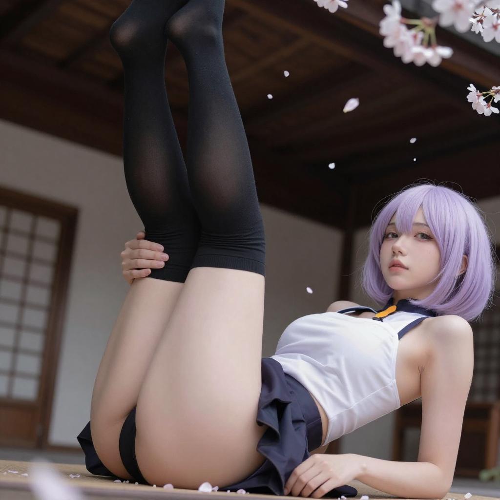 Photograph of a cosplayer with light blue hair, blue bows, and a blue scarf, wearing black thigh-high stockings and black lace panties, lying on her back with legs spread. She extends her hand towards the camera, creating a low-angle perspective. Background features white cherry blossom petals and a dark lattice.