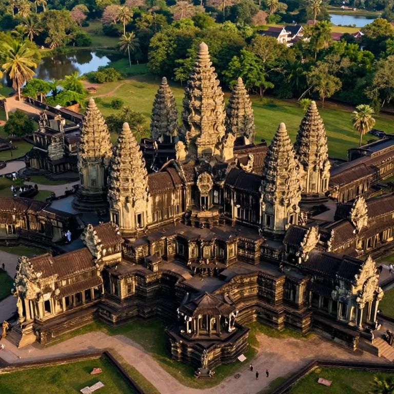 The image showcases an aerial view of Angkor Wat, a renowned ancient temple complex in Cambodia. The temple is captured in a modern, super-resolution, megapixel, 8K photograph, revealing intricate details of its architecture. The central structure, a towering pyramid, is surrounded by four smaller pyramids, each adorned with intricate carvings and statues. The temple's grandeur is accentuated by its vast, rectangular layout, with a central courtyard and multiple levels of terraces. The surrounding landscape is lush with greenery, including dense forests and a serene body of water, creating a harmonious blend of natural and man-made beauty. The temple's stone carvings and statues are bathed in a warm, golden light, highlighting their textures and craftsmanship. The overall composition is balanced, with the temple centrally positioned and the surrounding elements framing it, creating a sense of depth and scale.