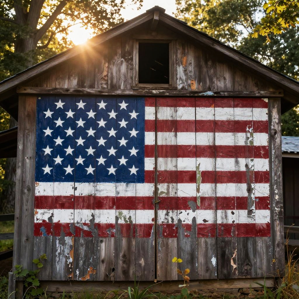 Us flag 52 stars painted on an old wooden barn wall in a rustic countryside setting, sun rays filtering through nearby trees, detailed wood textures with peeling paint, warm tones with nostalgic feel, hyper-realistic style with focus on star arrangement