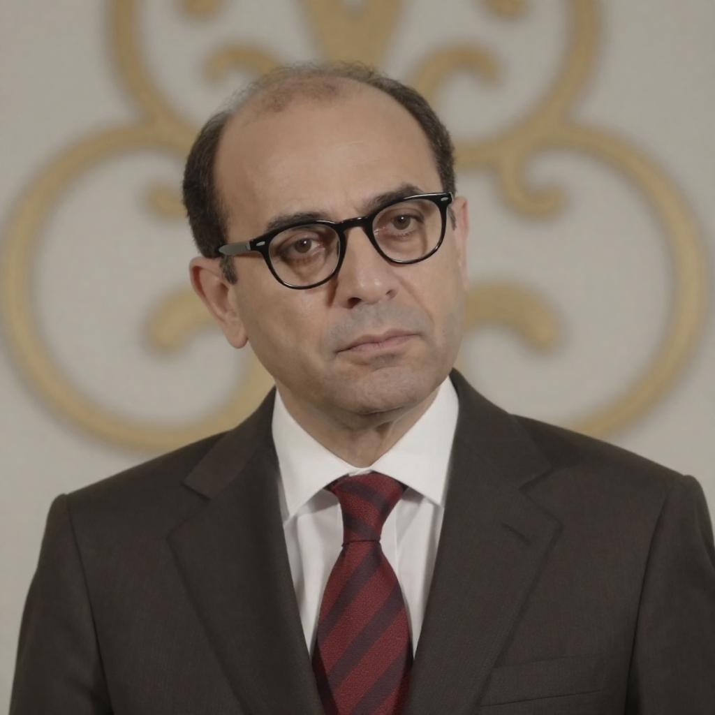Photograph of a middle-aged man with receding dark hair, wearing black-rimmed glasses, a dark brown suit, white shirt, and red striped tie. He has a serious expression and is slightly tilted to the right. The blurred background features a decorative, ornate white and gold pattern.